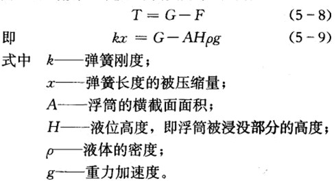 圖5-7所示是一種用壓彈簧平衡浮力,用差動變壓器測量浮筒位移的浮筒式液位計原理示意圖。浸沒于液體中的浮筒,上端通過連桿與彈簧及差動變壓器相連。這樣,浮筒除了受自身重力G、液體的浮力F外,還要受到被拉伸彈簧的拉力T。當液位一定,浮筒受力平衡時有