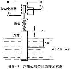 式(5-11)表明,液位的變化量與彈簧的長度變化量成正比。在此,彈簧起到了把大位移△H變成小位移△X的作用。由圖5-7可見,彈簧的長度變化量即是差動變壓器鐵芯的位移量。因此,差動變壓器的輸出反映了液位的高度,即將液位的變化轉換成電量的變化。