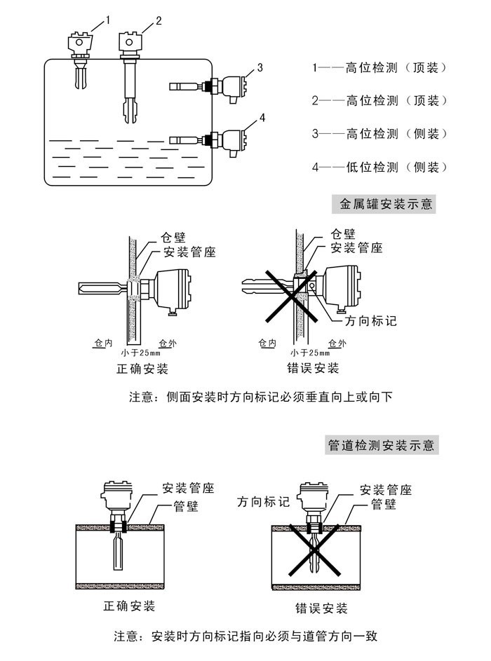 音叉式物位開關通常采用側裝(在倉壁側面安裝)方式安裝與倉體側壁對料位高度進行上下限位置的檢測;當倉體不便側面開孔時可采用頂裝(在倉的頂部安裝)方式安裝,位置應選擇能避開進料時物料沖擊的位置;亦可安裝與管道上防止泵的無料運行。