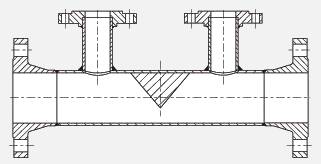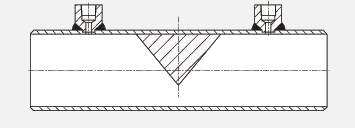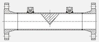 楔形流量傳感器結(jié)構(gòu)如右圖所示。楔形流量傳感器的檢測(cè)件是楔形孔板,它是一塊V形節(jié)流件,它的圓滑頂角朝下,這樣有利于含懸浮顆粒(粉塵、泥沙及其它固體顆粒)流體和高粘度液體流過(guò)時(shí)在節(jié)流件上游側(cè)不會(huì)產(chǎn)生滯流,也不會(huì)在節(jié)流體上、下游側(cè)發(fā)生固體顆粒或粘稠物的積存,從而確保了楔形流量傳感器長(zhǎng)期運(yùn)行精度在0.2級(jí),這樣高的長(zhǎng)期運(yùn)行精度在流量測(cè)量領(lǐng)域是迄今少見的。 |