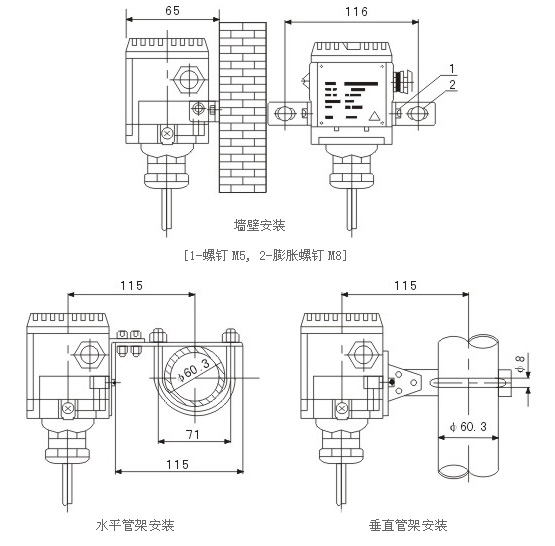 LK-LC/LR型投入式液位計變送器具有多種安裝固定方式,以適應(yīng)不同現(xiàn)場情況。當現(xiàn)場不能夠提供G2的內(nèi)螺紋或法蘭等工藝設(shè)施時,可選擇普通形式的液位變送器,它有墻壁安裝式、水平管架式和垂直管架式等叁種安裝方式可選擇,使您在現(xiàn)場安裝時得心應(yīng)手。